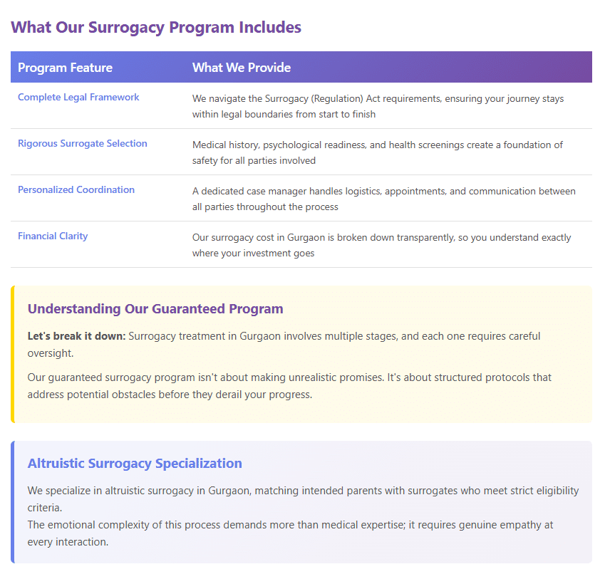 Let’s break it down: surrogacy treatment in Gurgaon involves multiple stages, and each one requires careful oversight. Our guaranteed surrogacy program in Gurgaon isn’t about making unrealistic promises. It’s about structured protocols that address potential obstacles before they derail your progress.